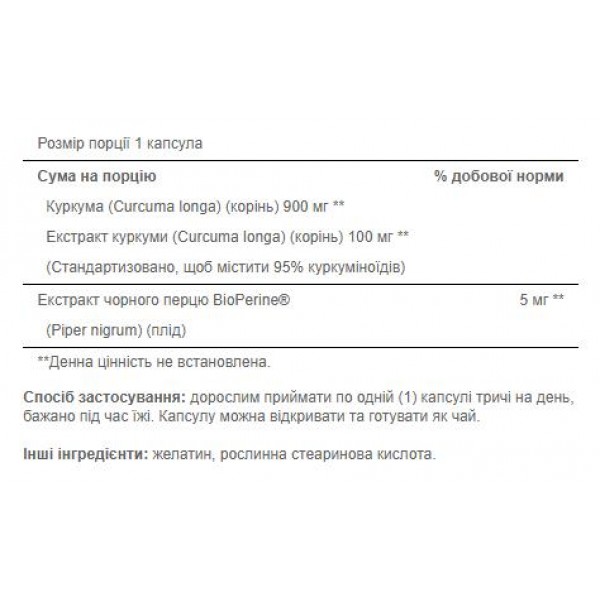 Зверніть увагу, що Куркумін з Біоперіном, Turmeric Curcumin 1000 Mg With Bioperine 5mg - 120 Capsules не є лікарським засобом. Не замінює повноцінного харчування. Не перевищуйте рекомендовану добову дозу. Використовуйте згідно з інструкцією виробника, яка є на упаковці або всередині неї.