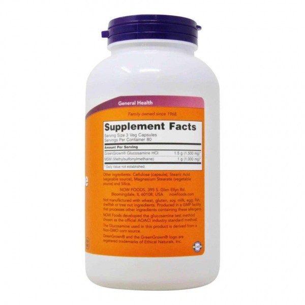 NOW Foods Vegetarian Glucosamine & MSM поєднує в собі два добре відомі інгредієнти для здоров'я суглобів у вегетаріанській/веганській формулі, яка не включає глюкозаміну, виробленого з молюсків. Глюкозамін є одним з найважливіших будівельних блоків для утворення глікозаміногліканів (ГАГ) та протеогліканів, основних компонентів хрящової тканини. Ці сполуки утримують воду, формуючи суглобову прокладку, забезпечуючи мастило та протистояння зносу хряща. МСМ (Метилсульфонілметан) є органічною формою сірки, мінералу, необхідного для виробництва глікозаміногліканів і протеогліканів.