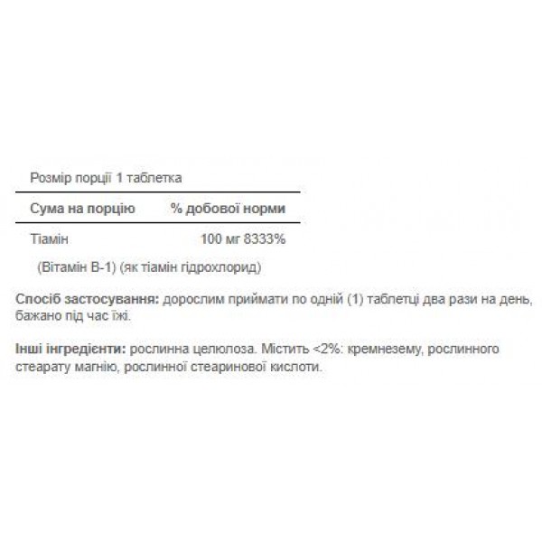 Зверніть увагу, що Вітамін В-1, Vitamin B-1 100mg - 100 tablets не є лікарським засобом. Не замінює повноцінного харчування. Не перевищуйте рекомендовану добову дозу. Використовуйте згідно з інструкцією виробника, яка є на упаковці або всередині неї.