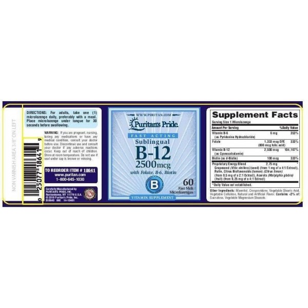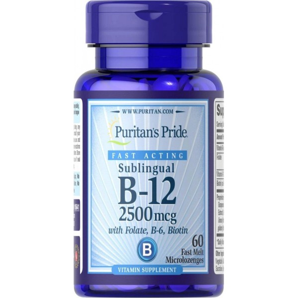Vitamin B-12 2500 mcg Sublingual with Folic Acid, Vitamin B-6 and Biotin, 60 Microlozenges Puritan's Pride