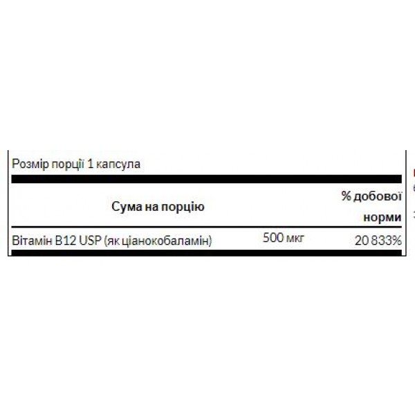 - Містить 500 мкг вітаміну B12 на капсулу.
