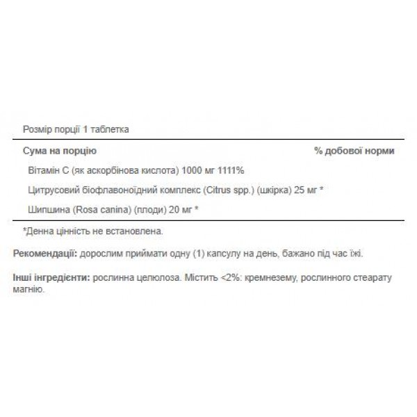 Зверніть увагу, що Vitamin C - 1000 mg with Bioflavonoids and Rose Hips - 100tabs не є лікарським засобом. Не замінює повноцінного харчування. Не перевищуйте рекомендовану добову дозу. Використовуйте згідно з інструкцією виробника, яка є на упаковці або всередині неї.