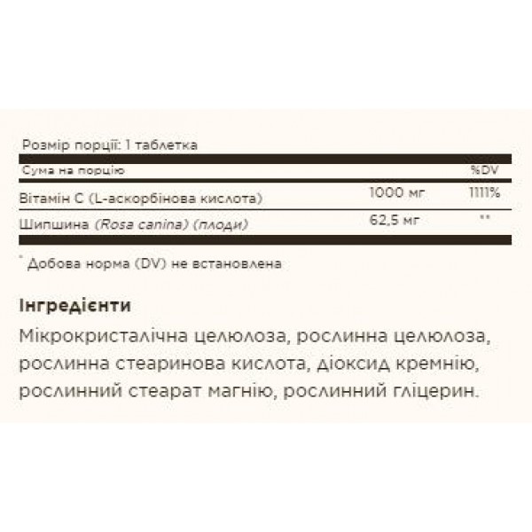 Зверніть увагу, що Вітамін С, Vitamin C W/Rose Hip 1000 mg - 100 tab не є лікарським засобом. Не замінює повноцінного харчування. Не перевищуйте рекомендовану добову дозу. Використовуйте згідно з інструкцією виробника, яка є на упаковці або всередині неї.