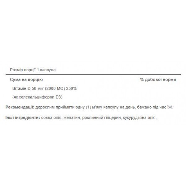 - Містить 50 мкг (2000 IU) вітаміну D3 в одній капсулі.
