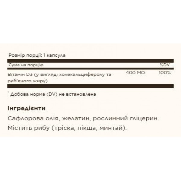 - Добова доза: Кожна капсула містить 10 мкг (400 МО) вітаміну D3, що відповідає денній рекомендованій нормі для підтримання оптимального рівня цього вітаміну в організмі дорослої людини.