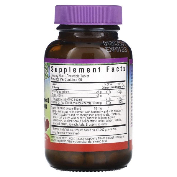 Вітамін D3 Super Earth Rainforest Animalz 400 МО від компанії Bluebonnet містить вітамін D3 (холекальциферол), корисні фрукти і овочі в одній смачній жувальній таблетці.