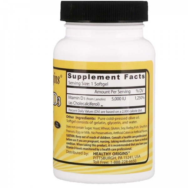 Вітамін D3 з 5,000 МО від Healthy Origins - це основна поживна речовина, виготовлена у формі рідкої капсули з високою абсорбцією. Вітамін D3 синтезується в організмі від сонячного світла, і тільки невелика кількість може бути отримано з їжі. Зимовий сезон і багато сонцезахисні продукти пригнічують здатність організму виробляти оптимальні рівні вітаміну D. У результаті, добавка вітаміну D3 стає ще більш необхідною, щоб забезпечити ваш організм його достатньою кількістю.