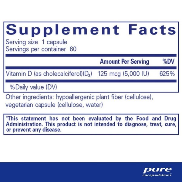 Одним з найкращих інструментів уникнення небезпечного дефіциту вітаміну D є високоякісна добавка. Капсули вітаміну D3 5000 IU від Pure Encapsulations відповідають вимогам: потужна добавка забезпечує прийом жиророзчинного вітаміну D, який також відіграє важливу роль у збереженні здорового рівня кальцію в крові. Ваш організм потребує вітаміну, щоб при необхідності переміщати кальцій з кістки в кровотік. Вітамін D відомий завдяки зміцненню здорових кісток і зубів, а вітамін D-3-це форма, яка зазвичай використовується в харчових добавках.