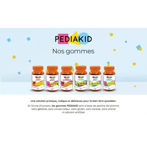 Pediakid спеціалізується на виробництві вітамінів і препаратів 100-відсоткового натурального походження, в основі яких знаходяться рослинні екстракти, мінерали. Вони не викликають алергії і робляться за технологією водогліцеринової мацерації, що дозволяє витягнути з рослини максимум корисних речовин, без використання хімічних реагентів. Натуральні медвежуйки Pediakid Gommes Vitamine D3 — функціональні жувальні вітаміни у формі ведмедиків, на основі 100-відсоткового натурального вітаміну D3. В його основі знаходиться яблучний пектин.