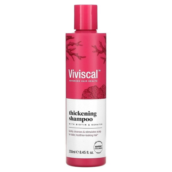 Шампунь для густоти волосся Viviscal™ містить біотин і кератин, збагачений морським колагеном і екстрактом морських водоростей, зміцнює та зменшує ламкість волосся, роблячи його природним об’ємом, густішим і здоровішим на вигляд*.