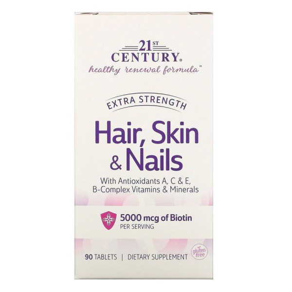 Формула 21 століття Healthy поновлення Extra Strength волосся, шкіра і нігті працює для підтримки довідкової вашої природної краси зсередини. Біотин і вітаміни А, С, Е, є поживні речовини, необхідні для сприяння глянцево волосся, міцні нігті і яскраві шкіри.