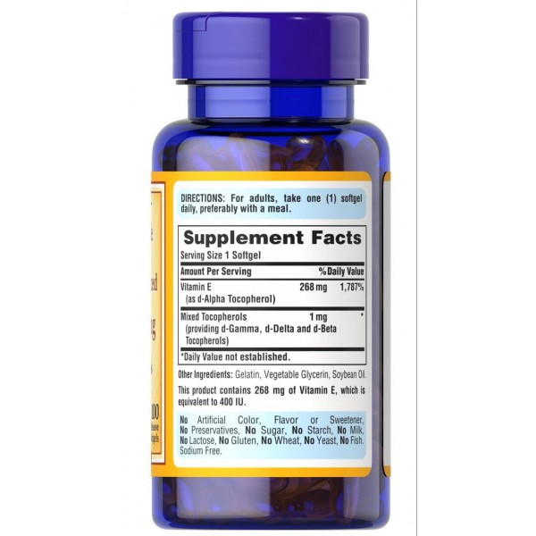 Puritan's Pride Vitamin E-400 IU 100% Natural Mixed Tocopherols - це дієтична добавка, що містить 400 МО вітаміну Е у формі змішаних токоферолів. Вітамін Е - це жиророзчинний вітамін, який є потужним антиоксидантом. Він відіграє важливу роль у захисті клітин від пошкоджень, спричинених вільними радикалами. Вітамін Е також підтримує здоров'я імунної системи, серця та шкіри.