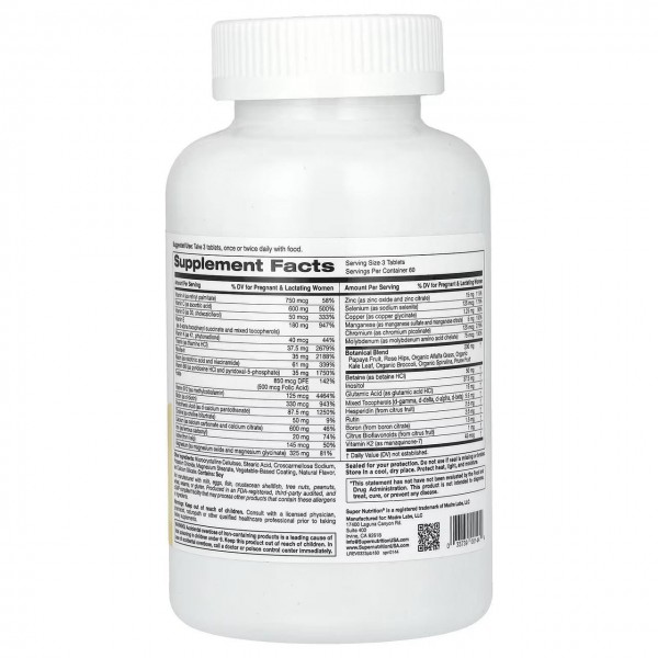 Super Nutrition Prenatal Blend Multivitamin with Folate and Choline містить повний список важливих вітамінів, мікроелементів і рослинних компонентів для підтримки час вагітності в таблетках. Не містить глютену та ГМО.