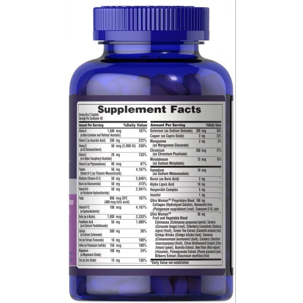 Puritan's Pride Ultra Woman™ Daily Multi Timed Release – спеціальна формула для активних жінок з поступовим звільненням поживних речовин. Потужна антиоксидантна підтримка. Зміцнює здоров'я кісток; сприяє здоровому метаболізму та виробництву енергії; підтримує здоров'я волосся, шкіри, нігтів, а також грудей та товстого кишечника.