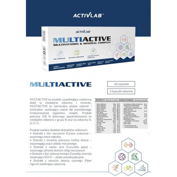 ActivLab Pharma MultiActive - це добавка, яка доповнює щоденний раціон дорослих людей усіма необхідними вітамінами та мінералами. Продукт також містить рослинні екстракти, такі як: екстракт листя артишоку, екстракт кореня кропиви, екстракт насіння гарбуза, екстракт листя зеленого чаю та екстракт плодів чорного перцю.