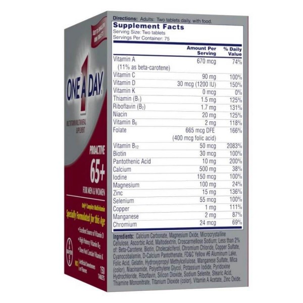 One A Day Proactive 65+ Multivitamin/Multimineral Supplement For Men & Women - єдиний комплексний мультивітамінний комплекс, спеціально розроблений для чоловіків і жінок віком від 65 років і містить основні поживні речовини, необхідні для цього віку.