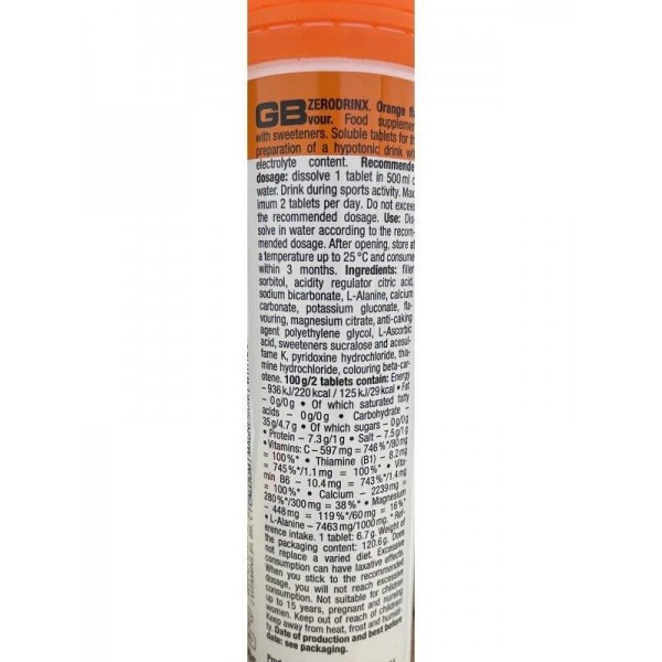 Унікальний гіпотонічний напій зі збалансованим поєднанням кальцію, магнію і вітамінів В1, В6 і С.швидкорозчинні таблетки, зі смаком апельсина без цукру і штучних барвників. Таблетки ZERODRINX найкраще підходять для занять спортом з високою частотою серцевих скорочень і втратою рідини і електролітів.