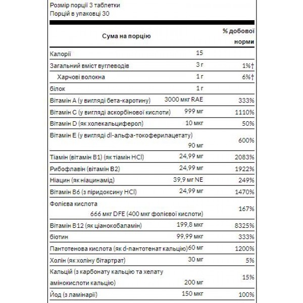 Swanson Whole Food Formula Multi Vitamin Mineral - це високоякісний продукт, розроблений для підтримки загального самопочуття та забезпечення організму необхідними поживними речовинами. Цей мультивітамінний комплекс містить широкий спектр вітамінів та мінералів, отриманих з натуральних харчових джерел.