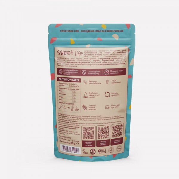 Sweet Life розроблений для того, щоб стати вашим щоденним помічником у контролі рівня цукру в крові, одночасно даруючи вам неймовірний смак солодкого, який залишається незмінним незалежно від кількості використаного продукту.
