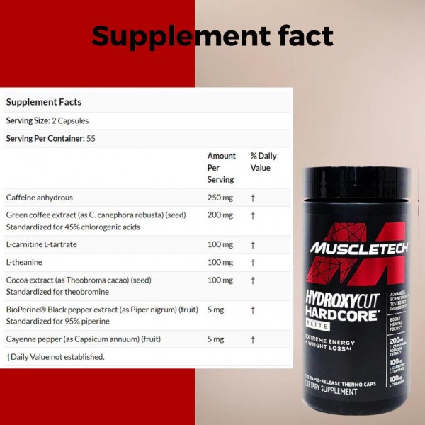 Новий Hydroxycut Hardcore Elite був повністю змінений в порівнянні з попередніми версіями. За допомогою потужних компонентів Coleus Forskohlii, L-теаніну, теоброміну та кофеїну, ця потужна формула викликає потужний термогенний ефект та неймовірний рівень енергії!