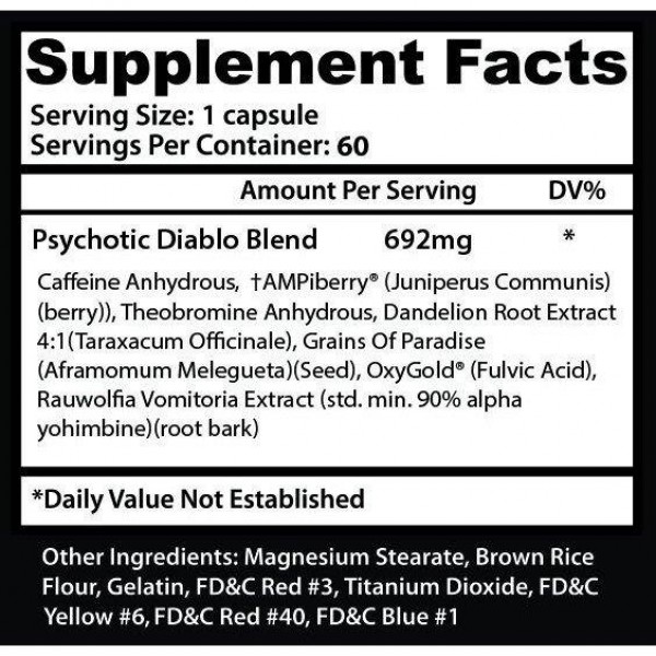 Psychotic Diablo - це повністю натуральний жиросжигатель, який стимулює розумову та фізичну продуктивність без пригнічення та негативного впливу на ЦНС. Також знижує апетит і прискорює жироспалюючі процеси навіть під час відпочинку.